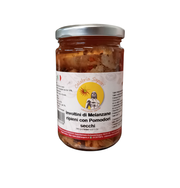 Involtini di melanzane ripieni con pomodori secchi, lavorati secondo tradizione e conservati in olio.