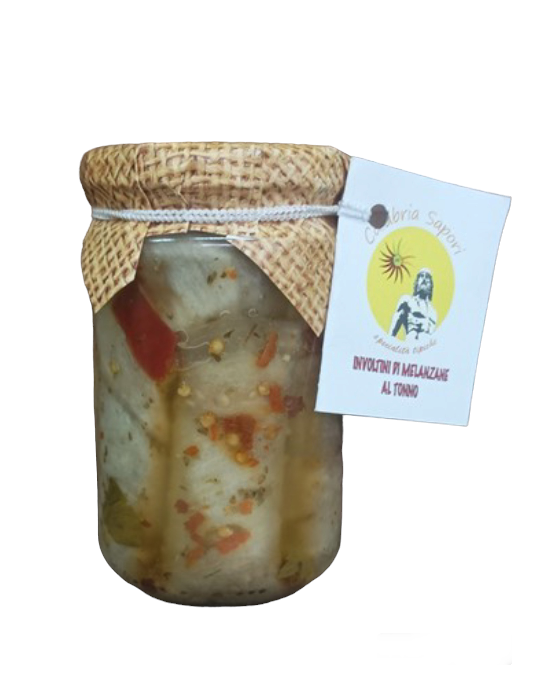 Involtini di melanzane preparati secondo tradizione, farciti con tonno e olive e conservati in olio.