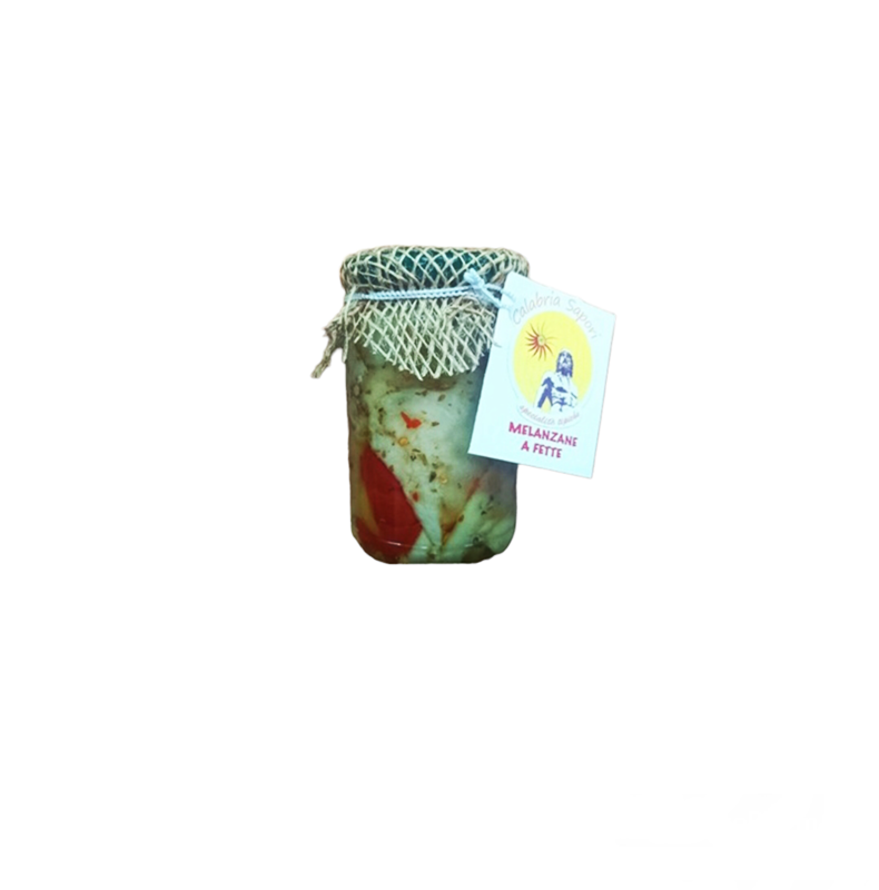 Melanzane a fette conservate in olio e aromatizzate con spezie tipiche della tradizione mediterranea.