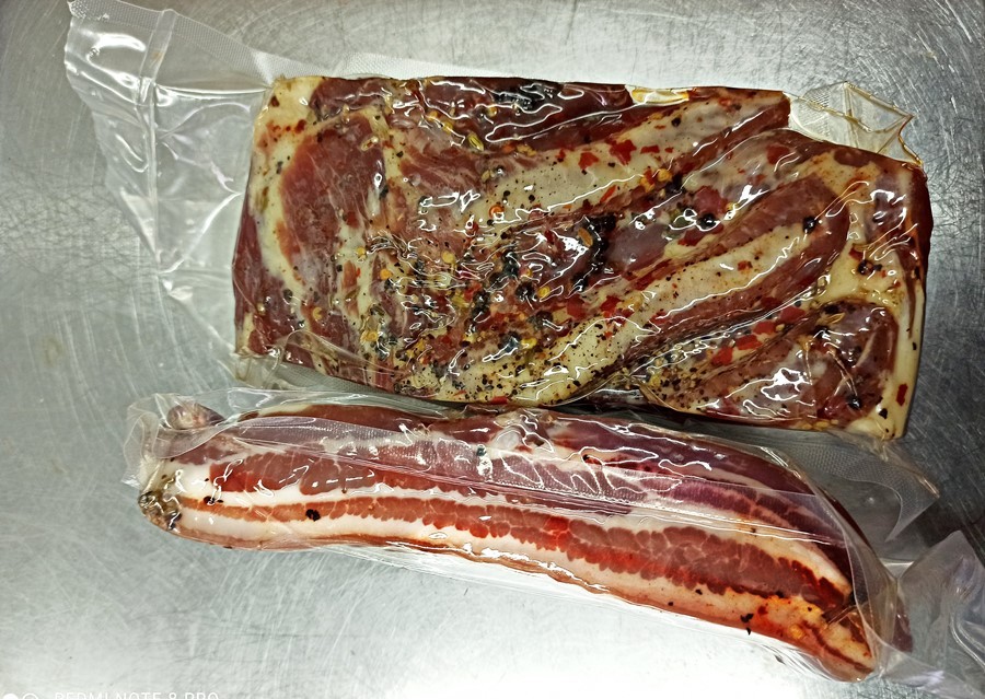 Pancetta tesa ottenuta da carne suina selezionata, lavorata secondo tradizione e aromatizzata con spezie.